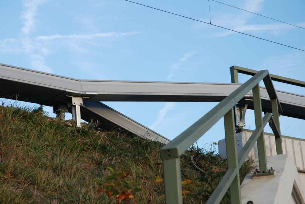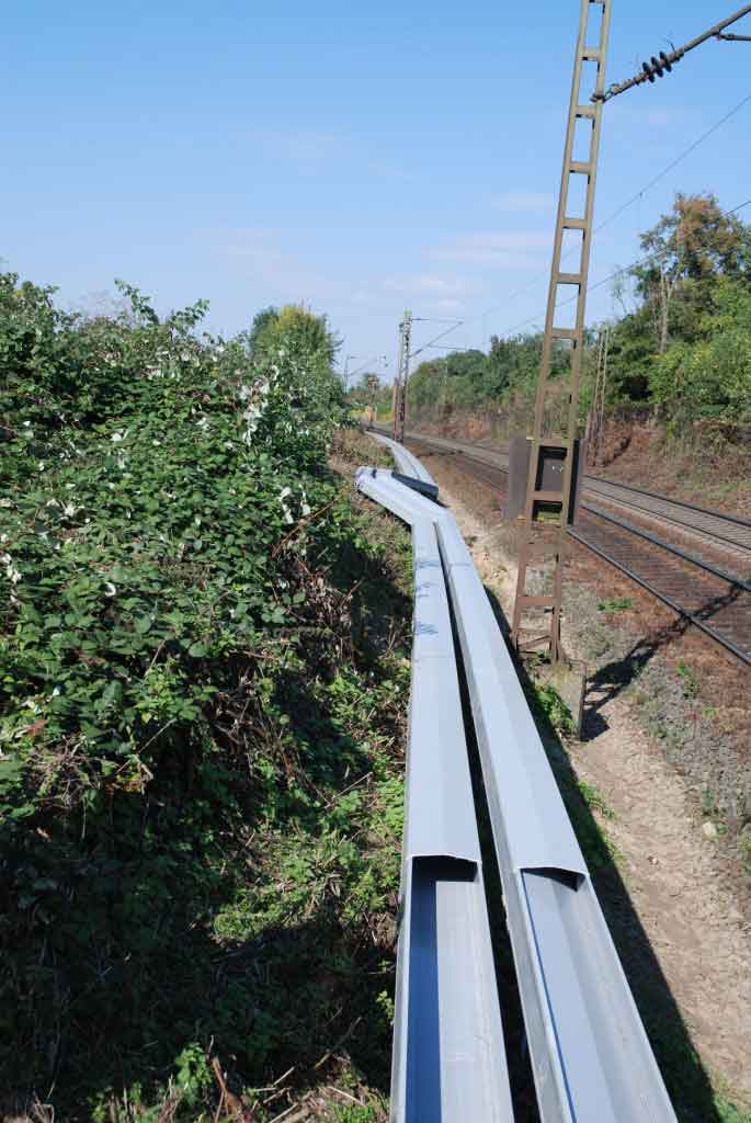Der aufgeständerte GFK-Kabelkanal ARCOSYSTEM bietet zuverlässigen Schutz gegen äussere Einflüsse und wurde für topographisch schwieriges Gelände entlang den Bahntrassen entwickelt. Die Stützweite zwischen den Pfosten beträgt 6 Meter. Der aufgeständerte GFK-Kabelkanal wird in Grösse 1 mit einem nutzbaren Querschnitt von 100 x150 mm und Grösse 2 mit 250 x 150 mm angeboten. ARCOSYSTEM ist aus glasfaserverstärktem Kunststoff und somit extrem leicht und stabil. Der GFK-Trog ist doppelwandig